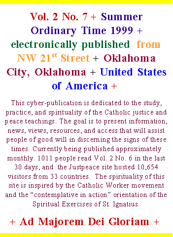 Snapshots of life during the collapse of the American Empire. The bombing has ended in Serbia, but Kosovo still burns. Today, the fires are set by our allies the Albanians and the targets are the Serbs and the Gypsies. The war against Iraq continues. The Israelis copy a page from Clinton and attack power plants in Lebanon. Three kids in Bellingham (Washington) were incinerated when a computer failure pumped 250,000 gallons of gasoline into a creek. Meanwhile, the seven richest countries (and their banks) offer the people of the 52 poorest countries $2.83 each in debt "relief" on their total per capita debt burden of $573. (Wow. Memo from the rich to the hungry: Eat Cake.) Truly these are troubled days for the cause of peace and justice. In such times, I am reminded of Dorothy Day's devotion to the Little Flower, St. Therese, and her thoughts of the "little way" of justice and peace. Where can you find this Way of justice and peace today? In a hundred thousand not-very-well-known places, such as a demonstration farm in Appalachia with low-cost buildings and Catholic schools and base communities in the barrios of Latin America, where unknown saints pick up the pieces of the lives shattered by the indifference and cruelty of the rich and the powerful, promoting healing, reconciliation, justice and peace. These are not times for procrastination or sloth. Whatever it is that you are doing for the Gospel of Jesus Christ -- do more! "May Christ's followers show forth their love for the poor and the oppressed; may they be one with those in need and abound in works of mercy; may they be compassionate towards all. . . " Prayer of the Holy Father for the Jubilee Year