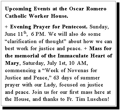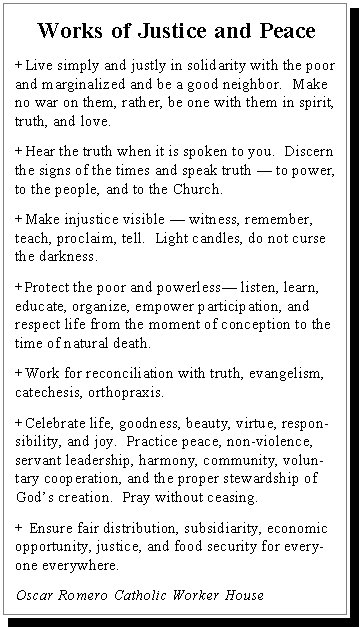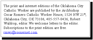 The Oklahoma City Catholic Worker print and internet editions are published by the Oscar Romero Catholic Worker House, 1524 NW 21st, Oklahoma City, 73106, 405-557-0436, rmwj@soonernet.com
