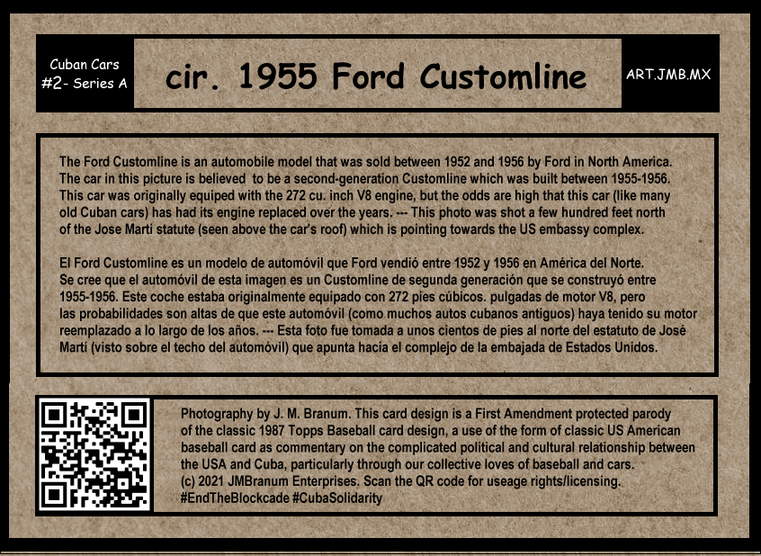 Photography by J. M. Branum. This card design is a First Amendment protected parody of the classic 1987 Topps Baseball card design, a use of the form of classic US American baseball card as a form of commentary on the complicated political and cultural relationship between the USA and Cuba, particularly through our collective loves of baseball and cars. (c) 2021 JMBranum Enterprises. Full details on licensing can be found by scanning the QR code. #EndTheBlockcade #CubaSolidarity